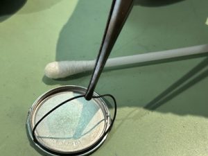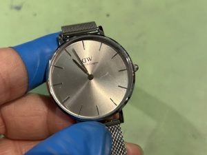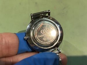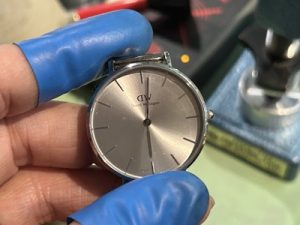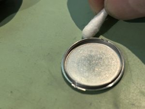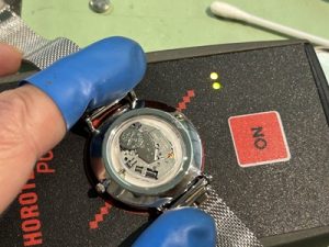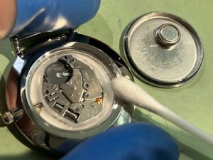 微細な汚れは内部のムーブメントに入り込まぬよう綿棒を用いてお掃除です。
