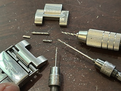 元のピンよりもほんの小さいドリルにて貫通。”Longines”