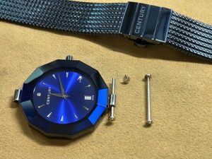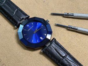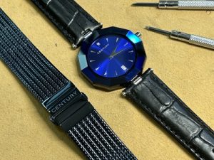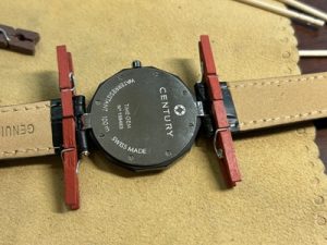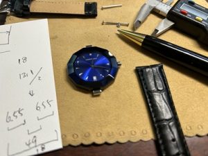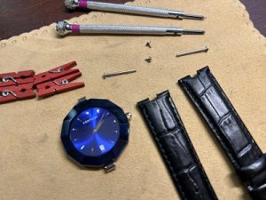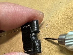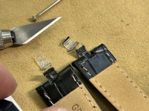 お選びいただいたブラックの革ベルト、加工し取り付けて行きます。