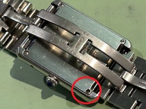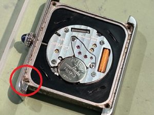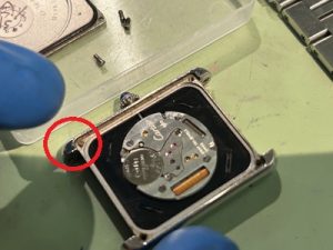 裏蓋からのネジを確認してみると5時位置裏側のネジが黒く頭が飛んじゃっている状況。