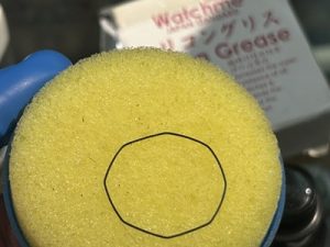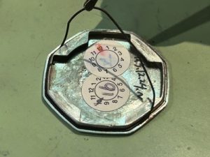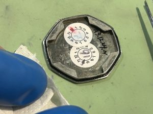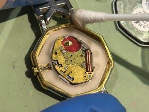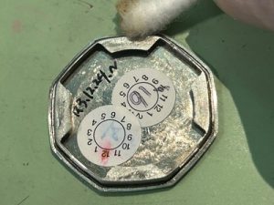 裏蓋を開き、古い電池を取り除き汚れなどのお掃除。電池との接点、接触端子にも汚れがあったので通電を良くしておきます。