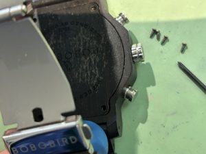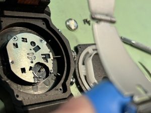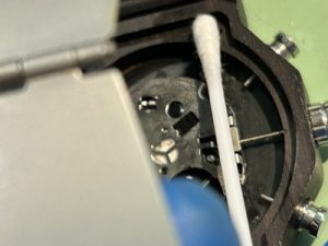 裏蓋が開けば、まずは観察。 古い電池を取り除き…