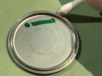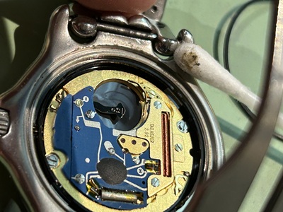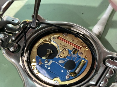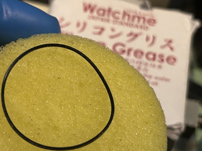 しっかりと閉じられた裏蓋はスクリューバック。防水性の高い時計ケースに採用されていますね。古い電池を取り除きパッキンの状態を確認。