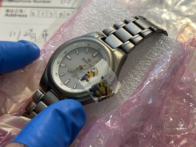 時刻合わせで竜頭を回したところ、ポロリ。錆の形跡が見て取れます。こうなると裏蓋を開いてムーブメントを見るのが…😱