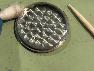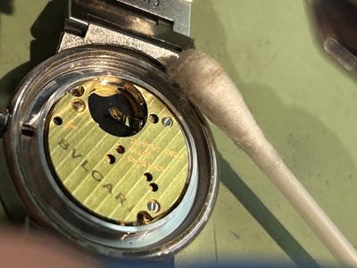 裏蓋とのすき間には汚れもありましたが、電池との接点も問題なく綿棒を使いお掃除しておきます。