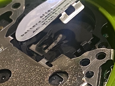 ここのフック金具をゆっくりと外側に広げ接触端子を確認。新しい電池へと入れ替えです。