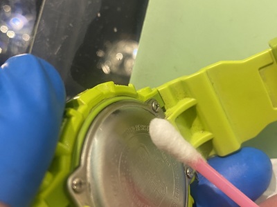 電池の交換はちとばかしお時間をいただいて進めて行きます。ご覧の通り裏蓋を上下のベルトが押さえている構造。一度片方のベルトを取り外しての作業です。