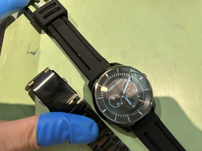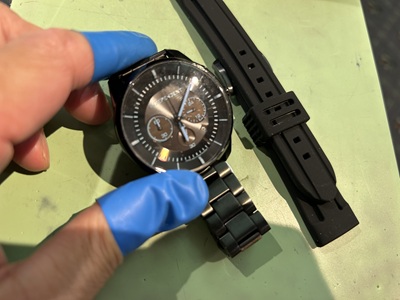 時計本体のサイズ計測、そして用意したのはラバーシリコンベルト。(※従来はウレタン製、よりしなやかで割れにくい😉)