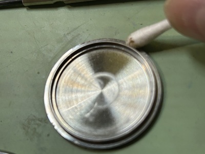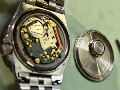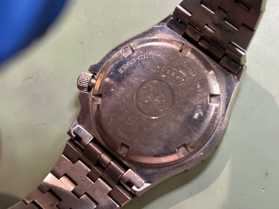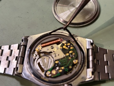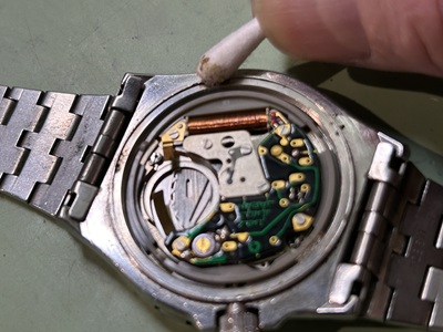 裏蓋を開きまずは観察から…。古い電池を取り除き接触端子を綺麗にし通電を良くしておきます。