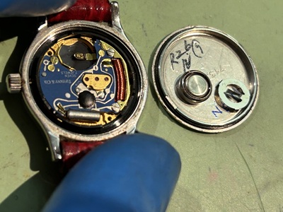 裏蓋を開き、古い電池を取り除き…まずは接触端子を綺麗にしておきます。