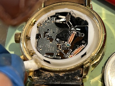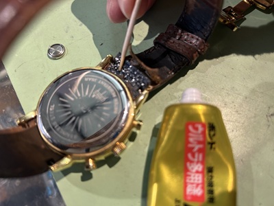 動作の確認もできたのでしっかりと裏蓋を閉じ、あとはここのベルト…ピタッと接着剤でお直ししておきましょう。